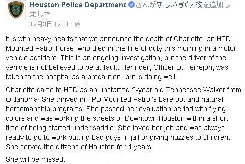 ヒューストン警察署がシャーロットの死をアナウンスしたFacebook