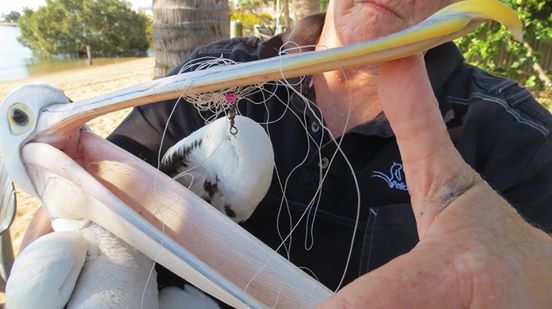 一羽のペリカンの嘴に網が絡まっているのを発見しました。