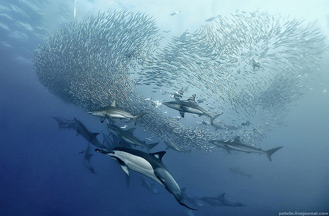 たくさんのイルカやサメ、アシカなどがイワシを食べています。